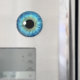 Blue Eye Iris © Sunny Mars Designs. Cool, fun custom printed blue eyeball cool novelty round fridge or refrigerator magnet with a trendy, modern, beautiful, unique, freaky, creepy, weird and twisted graphic illustration of a striking big blue realistic eyeball iris of an eye. Other colour eyeball designs are also available in store.