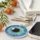 Blue Eye Iris © Sunny Mars Designs. Cool, fun custom printed blue eyeball novelty two sided acrylic round keychain or keyring with a trendy, modern, beautiful, unique, freaky, creepy, weird and twisted graphic illustration of a striking big blue realistic eyeball iris of an eye. Other colour eyeball designs are also available in store.