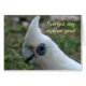 This strange character is called a blue-eyed cockatoo or "cocky." Related to a parrot, this unique Australian bird has white feathers, a distinctive blue featherless or bald circle around its eyes, a grey beak, and a crest of feathers characteristic of most cockatoos. Its legs are bluish grey. I took this photo in the Grampians National Park in Victoria, Australia.