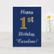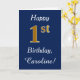 This simple birthday card design features the message "Happy 1st Birthday", with the "1st" having a faux gold-like appearance. It also features a customised name, and a dark blue background. It could be given to somebody who is celebrating their first birthday.