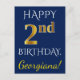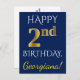 This simple, personalised birthday postcard design features the message "HAPPY 2nd BIRTHDAY", with the "2nd" having a faux gold-like appearance. The front also features a custom name, and a blue background. The back features a custom birthday greeting message, along with the customisable address of the birthday postcard recipient. It could be sent to somebody who is celebrating their second birthday. [~Z0000074]