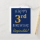 This simple, personalised birthday postcard design features the message "HAPPY 3rd BIRTHDAY", with the "3rd" having a faux gold-like appearance. The front also features a customised name, and a blue background. The back features a personalised birthday greeting message, along with the customisable address of the birthday postcard recipient. It could be sent to somebody who is celebrating their third birthday. [~Z0000074]