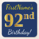 Blue, Faux Gold 92nd Birthday + Custom Name Square Paper Coaster