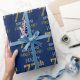 This wrapping paper design features a message like "HAPPY 77th BIRTHDAY", with the "77th" having a faux/imitation gold appearance. It also features a customisable name, and a blue coloured background. It could perhaps be used when wrapping gifts being given for somebody’s seventy seventh birthday. [~Z0000135]