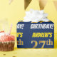 This wrapping paper design features a message like "ANDREW’S 27th BIRTHDAY!", with the "27th" having a faux/imitation gold-like colour appearance, and with the name and "BIRTHDAY" in a fun, bold font. The name can be customised, and the background is coloured blue. Wrapping paper like this could perhaps be used when wrapping birthday gifts being given to somebody in celebration of their twenty seventh birthday. [~Z0000209]