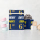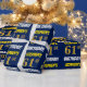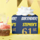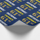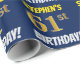 This wrapping paper design features a message like "STEPHEN’S 61st BIRTHDAY!", with the "61st" having a faux/imitation gold-like colour appearance, and with the name and "BIRTHDAY" in a fun, bold font. The name can be personalised, and the background is coloured blue. Wrapping paper like this could perhaps be used when wrapping birthday gifts being given to somebody in celebration of their sixty first birthday. [~Z0000209]