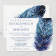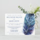 Blue feather wedding invitations with customisable blue text, when couple host with their families, printed on white background