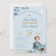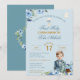 Stunning First Holy Communion floral invitations featuring rustic, vintage inspired elements with boy in suit, against a soft blue background. The back of the invitation features a boho style cross with watercolor wreath flowers and greenery against sea blue background. Simply edit the text template to include your own details. Background colors can also be edited to a color of your choice. Swap out 'First Holy Communion' for 'Christening' or 'Baptism' whichever suits your special event.
