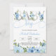 THis is gorgeous boy baby shower invitation features baby blue florals and silver foil lettering