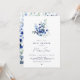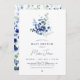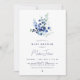 Blue floral baby shower invitation in a minimalist style with a blue flower bouquet and pattern back. You can personalise this invitation with your own details under the "Personalise this template" section.