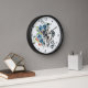 Tucked into this arrangement of blue and orange watercolor flowers is a beautiful Dalmatian. Dark grey numbers and diamond shaped markers around the perimeter make this clock easy to read. Everything is placed on a white background.