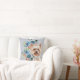 Tucked into this arrangement of blue and orange flowers is a beautiful watercolor image of a Yorkshire Terrier. The image is placed on a pale gray background. Both sides of the pillow have the same image.