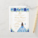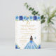 This elegant and glamourous birthday party invitation features a beautiful princess with brunette hair and fair skin in a blue ball gown. The text combines handwritten script and modern sans serif fonts for a classy and sophisticated look. The floral arrangements, butterflies and gold confetti create the perfect blend of rustic and chic.