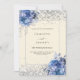 A cream coloured background decorated with blue roses, flowers and faux silver confetti. Personalise and add your names and wedding details. Black letters.