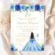 This elegant and glamourous birthday party invitation features a beautiful princess with dark hair and dark skin in a blue ball gown. The text combines handwritten script and modern sans serif fonts for a classy and sophisticated look. The floral arrangements, butterflies and gold confetti create the perfect blend of rustic and chic.