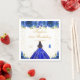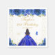 This elegant and glamourous birthday party napkin features a beautiful princess with dark hair and dark skin in a royal blue ball gown. The text combines handwritten script and modern sans serif fonts for a classy and sophisticated look. The floral arrangements, butterflies and gold confetti create the perfect blend of rustic and chic.