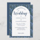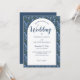 This custom wedding invitation features illustrations of light blue delphinium flowers set against a navy blue background. The white arch or archway shape at the centre is ready to be personalised with all of your details in coordinating navy blue lettering.