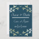 This is a beautiful floral, vine/leaf pattern combined with a rich luxurious blue background and a little bit of elegance and sophistication in the curvy font. I feel that this invitation covers all bases. You have a beautiful floral/leaf pattern with an elegant font, as well as a bold rich blue colour to work around. What more would a girl want? I can picture this beautiful blue colour with ivory flowers and waist ribbons flowing down the back of each attendants gown. Gorgeous! Imagine live greenery wreath crowns with just a little baby’s breath (Gasp) for the attendants with a combination of blue and ivory ribbons flowing off the back. The maid of honour will have a wreath crown of baby’s breath and ivory ribbons flowing from hers. It will be the wedding of the year. Send me an invite!