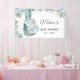 Sweet boy's baby shower banner featuring an elephants trunk, baby elephant, some foliage and a hint of a blue flowers. This elephant themed baby shower banner is ideal for a boy's elephant themed baby shower.