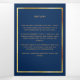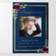 An elegant tri-fold program. A navy blue background, a faux gold frame, burgundy florals and space for your photo. Personalise and add name, dates and your text.