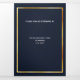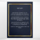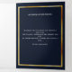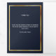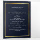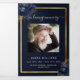An elegant tri-fold program. A navy blue background, a faux gold frame, blue florals and space for a photo. Personalise and add name, dates and your text.