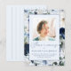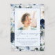 This is a modern and elegant blue floral celebration of life "Share a memory" card. The design features a beautiful calligraphy font and watercolor blue and white florals and a personalised photo. Allow your guests to share a wonderful memory of your loved one with you as a treasured keepsake. Please contact the designer for any queries regarding this design or for any matching products.