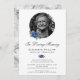Elegant blue floral memorial service/celebration of life/funeral invitation featuring a silver photo frame adorned with blue roses and greenery. Silver marble background at the back. Easily personalise this card with a photo of your loved one and the memorial/celebration of life/funeral details.