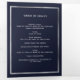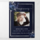An elegant tri-fold program. A navy blue background, a faux silver frame, blue florals and space for a photo. Personalise and add name, dates and your text.