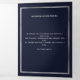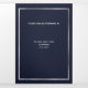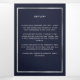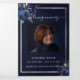An elegant tri-fold program. A navy blue background, a faux silver frame, blue florals and space for a photo. Personalise and add name, dates and your text.