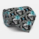 Grey skulls and teal blue flowers are the feature on this unique and attractive neck tie. The pattern is placed on a dramatic black background.