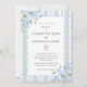 Beautiful hand drawn blue watercolor flowers with flowing greenery of vines and leaves creating a beautiful background stripe pattern for this lovely wedding invitation. Coordinating pattern on reverse side.