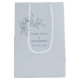 Blue Floral Wedding Gift Bag. Romantic and timeless, this dusty blue wedding gift bag with bride and groom's name features vintage line art floral roses and peonies that can be used for any wedding season. Add a touch of modern and classic elegance to your special day with this stylish and beautiful belly band. Navy text on a blue grey background.