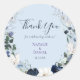 Simple and elegant, this wedding thank you sticker design uses blue, green, ivory and silver grey watercolor botanicals on top of a pretty pale blue background.
