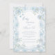 Beautiful blue watercolor fancy frame surrounding lovely fonts and scripts done in coordinating colors baby shower invite. A blue and white sweet coordinated floral background with soft blue flower accents with delicate green leaves. A perfect baby shower invitation for any season.