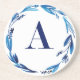 Watercolor design features lovely blue floral wreath and initial 'A' in centre