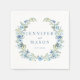 Perfect for your botanical wedding celebration, these exquisite paper napkins feature a stunning blue flower wreath. Personalised with the names of the bride and groom, these napkins add an elegant and personalised touch to your table setting.