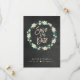 This design features the words "save our date" in a cream coloured handwritten script inside a beautiful blue flowered wreath. Couple's names and wedding details are displayed below and can be customised. Background is a black chalkboard look. Graphics ©Lilian Ellaboudy Design