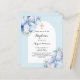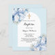 A white arch frame and light blue background.  Decorated with blue and white flowers and bows.  A golden cross. Personalise and add a name and details.