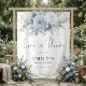 Dusty Blue Florals Fabric Welcome to Bridal Shower backdrop. The main header is in a stylish set script and the rest of the text you can easily personalise.