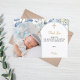 Add your own vertical size photo. A baby blue coloured arch shaped photo frame. A white background colour, decorated with blue forals, flowers. Personalise and add a name and details.