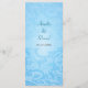Floral scrollwork makes a unique look for this lovely blue wedding menu card. The image is repeated on the bottom as a watermark to offset the customised wedding menu text. The entire image is repeated on the reverse in an opposite manner and text can be added or removed above it. An elegant and classic look for a special day. Available in alternate colours with matching products.