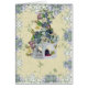 Beige background with green ivy and white flower pattern, and blue and white hydrangea card border edges the card. Central image is of a hanging birdhouse/gazebo with cascading violets, lilies, hydrangeas, and other types of flowers. Small bird is inside the gazebo sitting on a tuffett. Inside Blank.