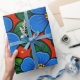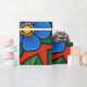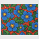The design features large stylized flowers with rounded petals in rich shades of blue. Each flower has yellow center made of small circular details that add contrast and visual interest. The flowers are surrounded by smooth, pointed green leaves in different tones, giving a fresh and natural feel. The background is filled with a strong red color that enhances the vibrancy of the blue and green elements. Small yellow dots are scattered throughout the design, adding a playful and decorative touch. The overall style is flat, clean, and bold, with clear outlines and strong color harmony.
