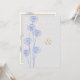 An elegant wedding invitation featuring a beautiful blue flowers with slightly transparent blue circle on a light grey background and the illusion of twinkly lights. It gives the illusion of the bride and groom's name on the front of being embossed.