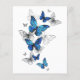 Flying Blue Butterflies morpho and white butterflies on a light abstract background. Morpho. Design with blue butterflies morpho.