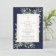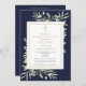 An elegant personalised celebration of life funeral photo remembrance invitation featuring botanical watercolor greenery foliage on a navy blue background. Designed by Thisisnotme©