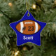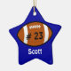 Custom football Christmas ornament done in a blue star shape ornament, with name in white and jersey number in black on a football icon. Personalise the name or text to suit your needs. Makes a nice ornament for kids or your star football player.