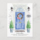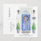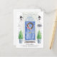Announce your new address with our stylish announcement featuring a blue front door, welcome mat, slate sign, topiaries and a floral wreath set on a grey brick background.