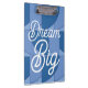 Blue Geometric Abstract Art Clipboard designed by Nisha Prabhu. Fully Customisable. Personalise with your name. Introducing our Blue Geometric Abstract Art Personalised Clipboard, a stylish and functional accessory that combines artistry with practicality. This clipboard is designed to elevate your workspace and add a touch of creativity to your daily tasks. Featuring a captivating design of beautiful blue geometric shapes with personalised quote ''Dream Big'', this clipboard is a true visual delight. The abstract patterns and bold colours create an eye-catching aesthetic that will make your clipboard stand out from the rest. But what sets this clipboard apart is its personalisation feature. Add your name, initials, or a motivational quote to the front, and make it uniquely yours. This customisation option allows you to showcase your individuality and infuse your workspace with a personal touch. Whether you're using it at work, school, or home, this clipboard is designed to enhance your productivity and organisation. It provides a stable writing surface, making it convenient for taking notes, filling out forms, or working on any task that requires a steady hand. If you're ready to add a touch of artistic flair to your workspace while staying organised and efficient, our Blue Geometric Abstract Art Personalised Clipboard is the perfect choice. Elevate your work experience and make a statement with this unique and practical accessory. Get yours today and showcase your style!