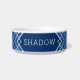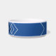 Unique pet bowl design in navy blue, white, and royal blue with overlapping geometric lines and squares with a cat or dog's name printed in the middle of the front of a white ceramic food or water bowl. DESIGNER TIP: All colours and fonts are editable so you can design your own creative bowl as a work of art that matches your decor!
